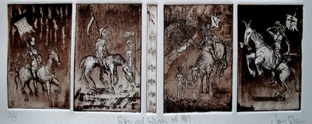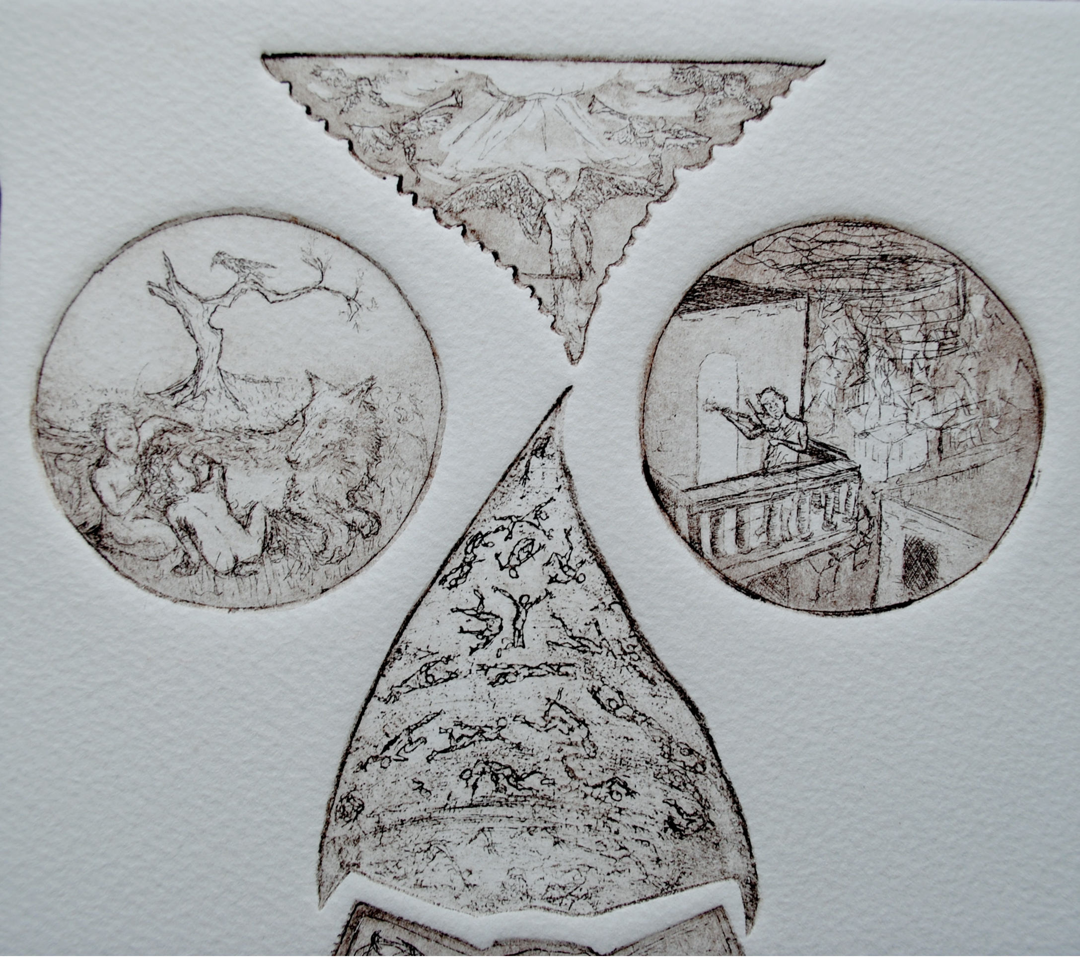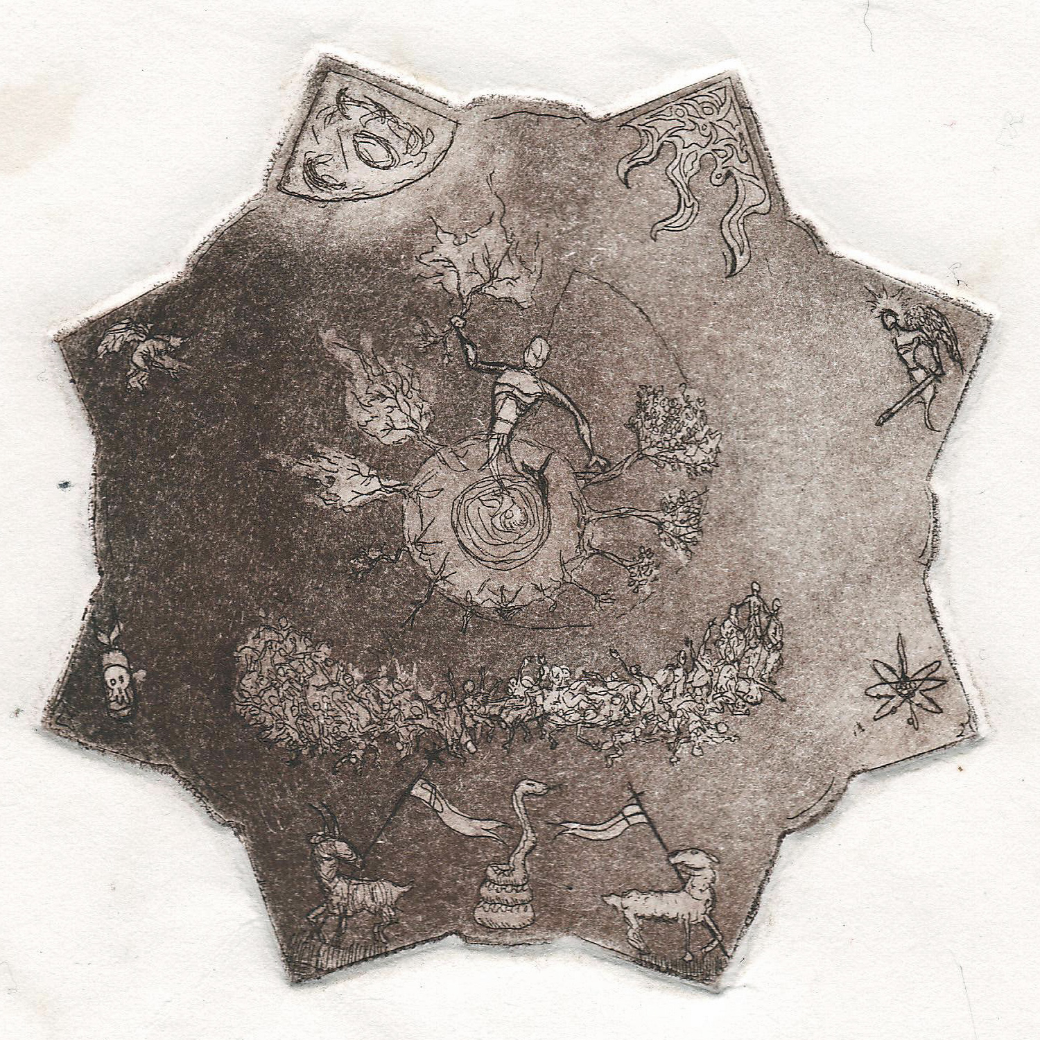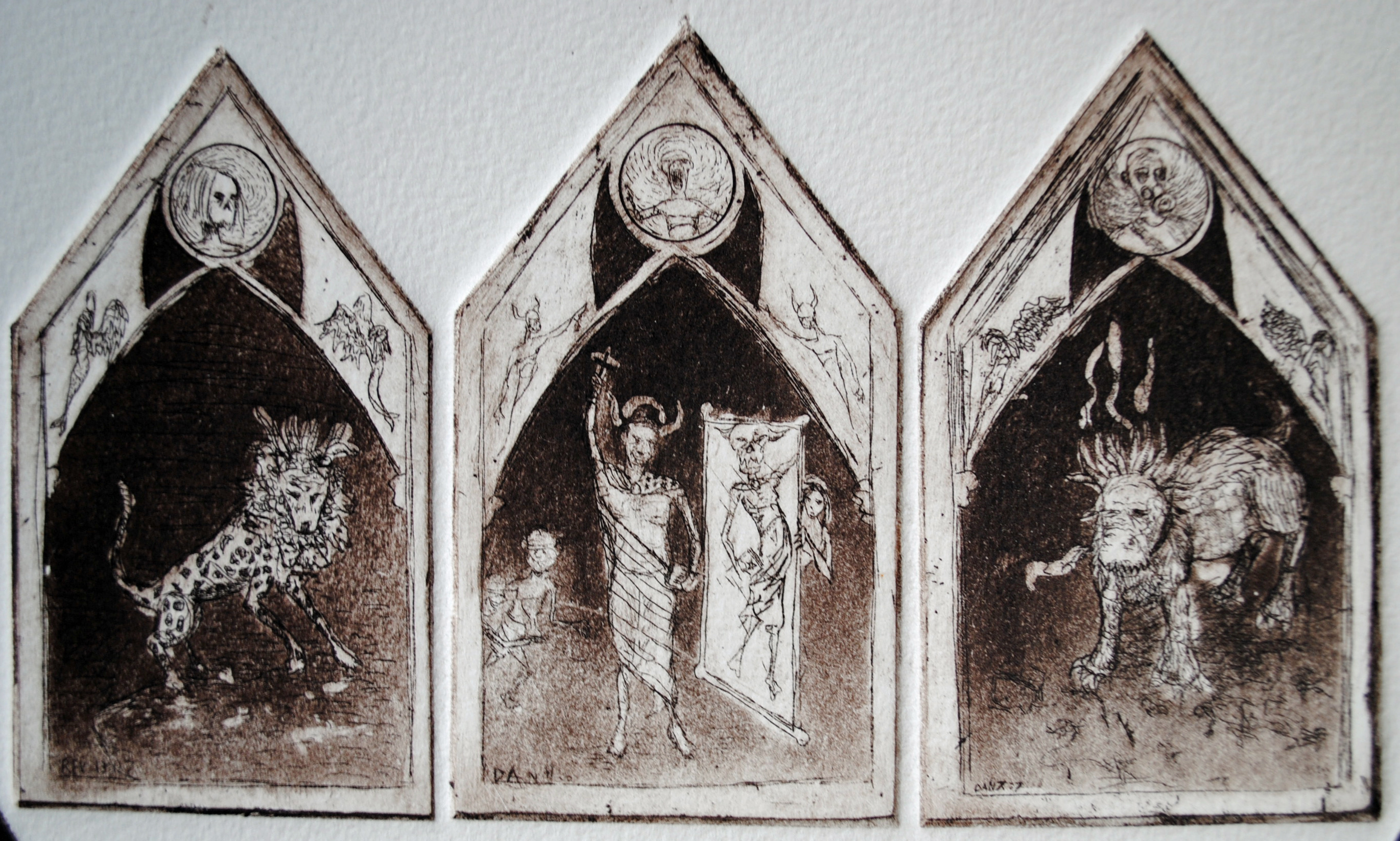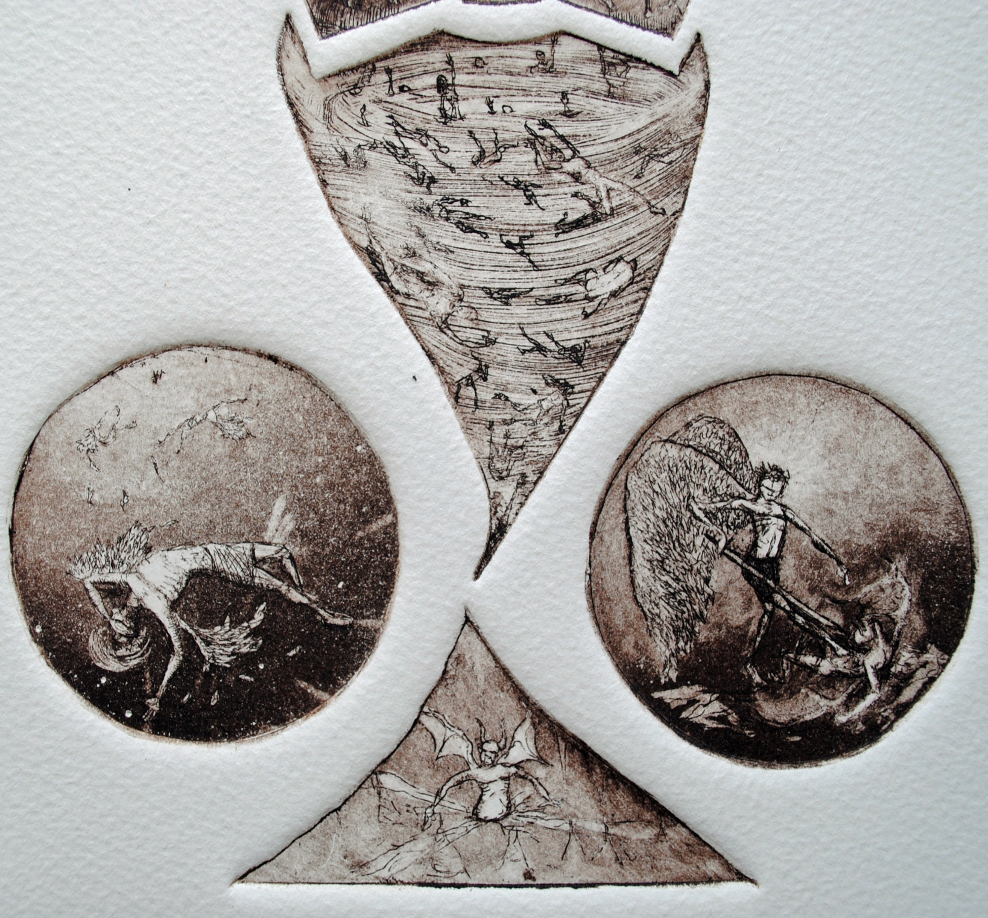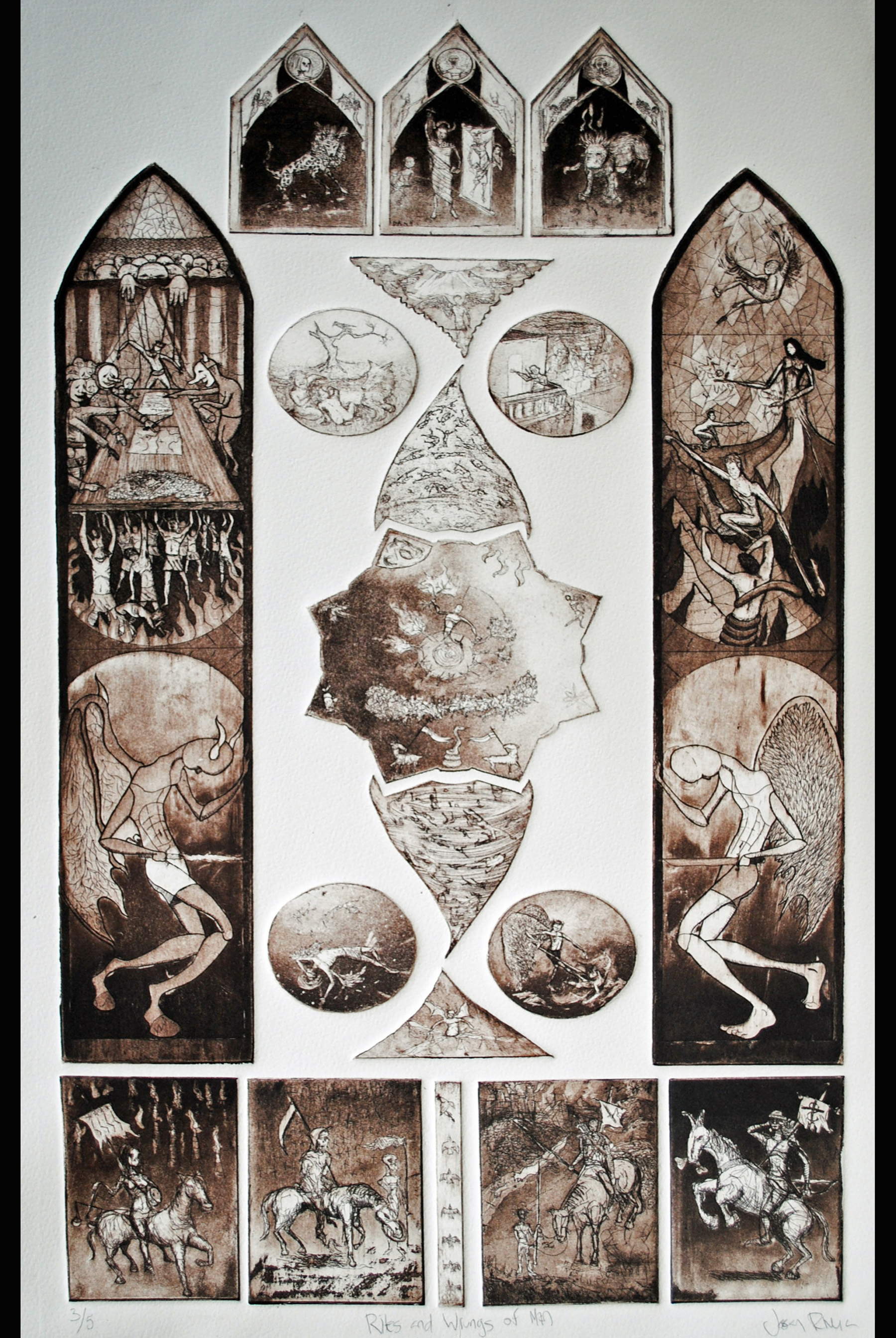 One of my favorite pieces, but one that has rarely been seen. A 20 by 24 inch multiplace intaglio (19), this was a daunting task. 5 were printed, each one taking several hours to prep each plate and setting it up on the press. Of these 5, only 1 is available for sale. This was completed in the summer of 2004 in about a 6 week period. It’s more a less a conglomeration of religious and philisophical things that had my interest at the time. Religious symbology had been prominent in a lot of my work, heavily influenced by my childhood in Italy. The Divine Comedy by Dante was an inspiration as well. I combined these things with the current state of the nation back in 01-04 to create a visual map of sorts. More of a spiritual than a religious person, I have always found a fascination of symbology in general. This was the end result