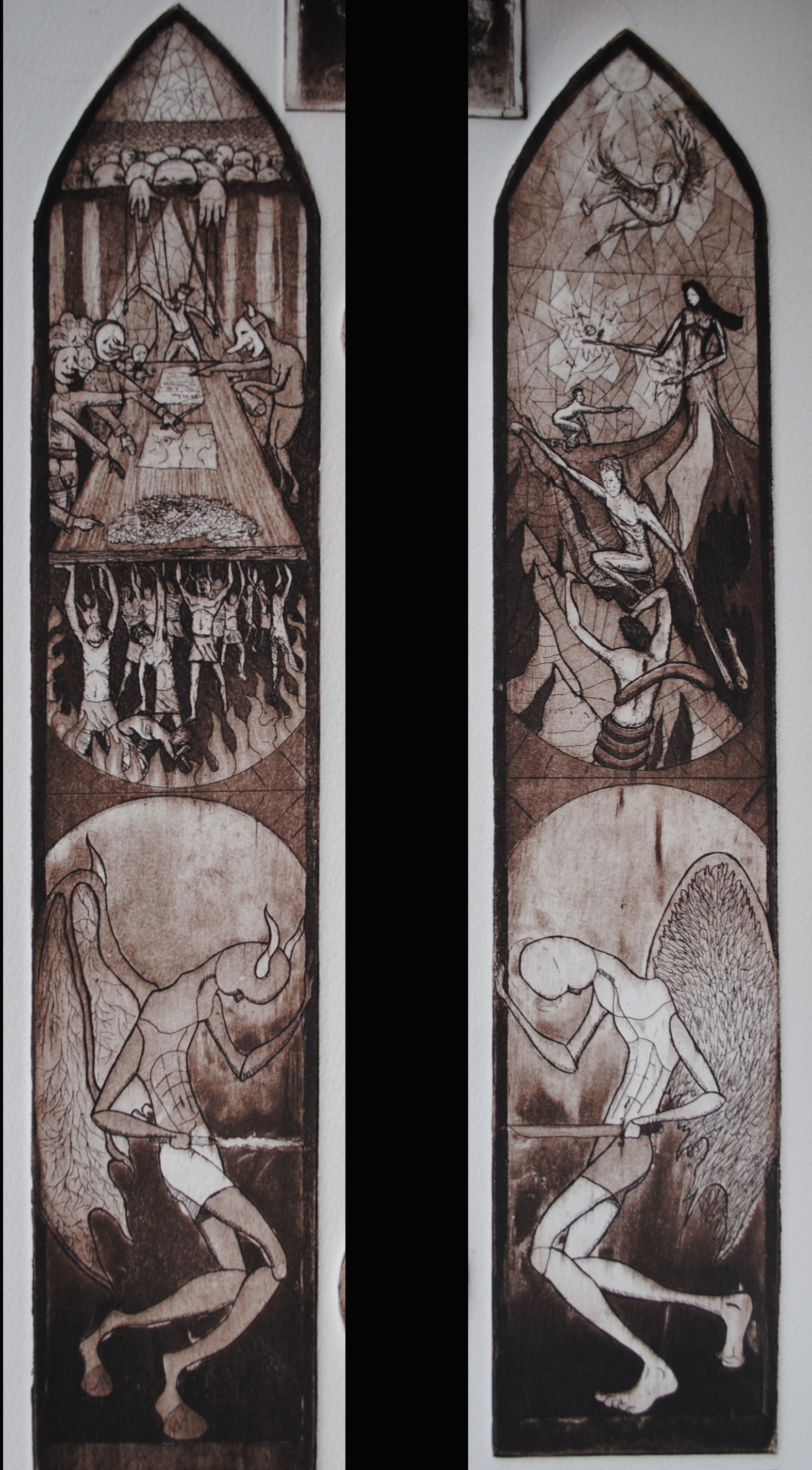 (Left) The greedy line their pockets as they make wartime deals. The puppet king is oblivious that they hands that run his strings are more concerned with success of their business partners than the well being of a nation. These events are unwilling supported by the people, whose money and livelihoods are on the table being dealt away. (Right) Icarus falls after flying to close to the sun. Man struggles against the constriction of Ignorance to reach Inspiration. She offers him knowledge that can better the world or destroy it. Icarus uses his inspiration to fly, only to fall after getting to close to the sun (melting his wax wings).