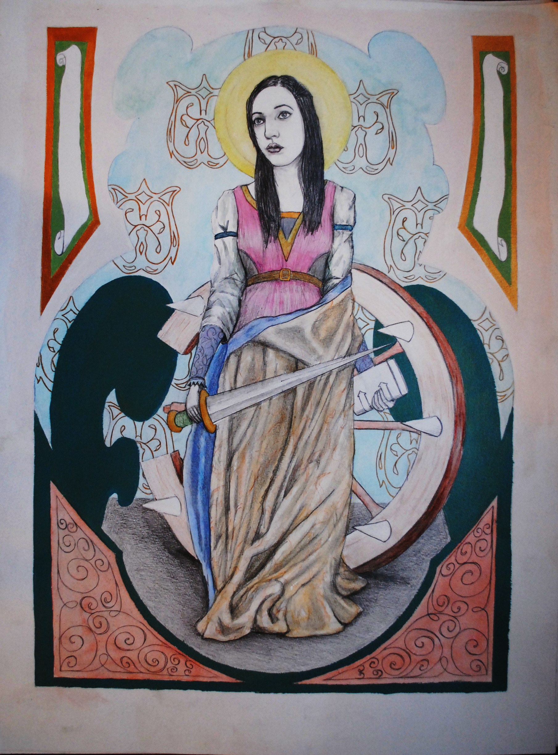 St Catherine of the Wheel. Daughter of the pagan governor of Alexandria, converted to Christianity in her teens. She visited the Emperor of Rome, Maximus where she managed to convert his wife. In turn he sent many philosophers to dispute with her, all who ended up converting (they were subsequently martyred) He eventually had her imprisoned, and when the people visited her end up converting he had her put to death by the breaking wheel. According to legend, the wheel itself broke when she touched it, so she was beheaded.
