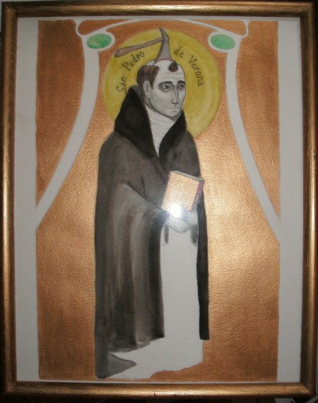 St. Peter of Verona. Italian priest murdered by an assassin hired by the Milanese Cathars, a christian heretical group. According to legend, his murderer struck his head with an axe. He then dipped his fingers in it and wrote on the ground: “Credo in Unum Deum” while reciting the Apostle’s Creed. All while missing the top part of his head. His murderer eventually confessed his crime and ended his days as a lay brother in a Dominican monastery , where he enjoyed local veneration as one of the blessed.