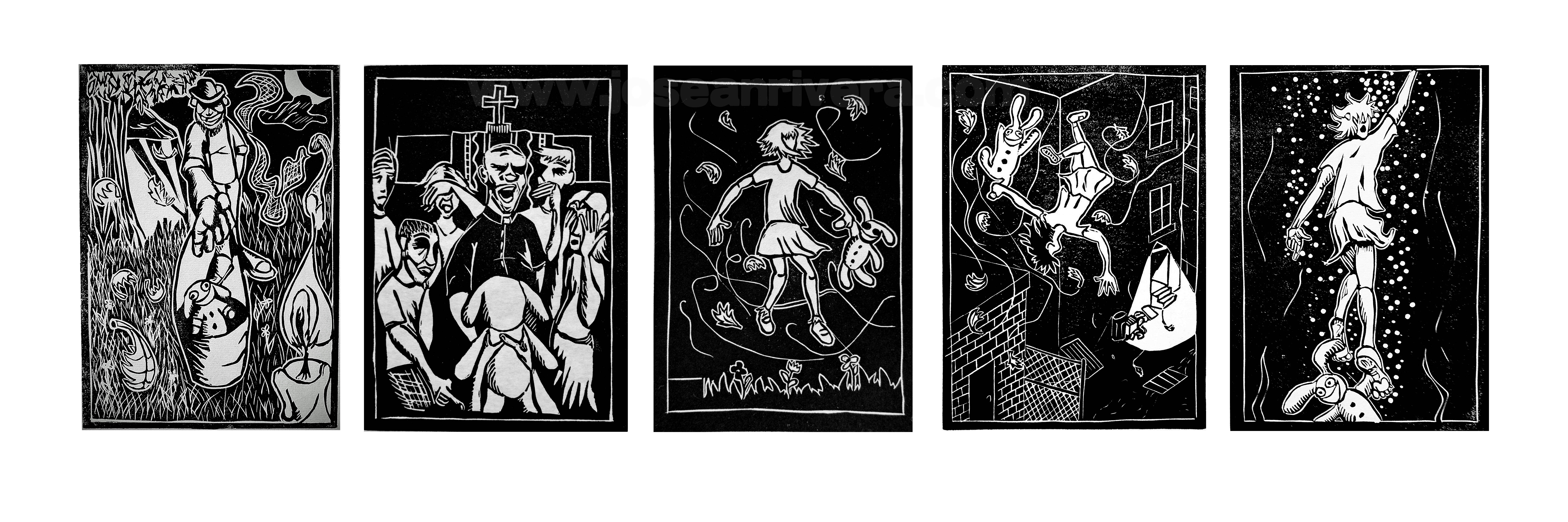 One of my earliest printmaking endeavors, it was inspired by the song of the same name by Phish. A haunting, melancholy song, “Esther’s” music is “lyrical, evoking a circus mood, soaring flights through the clouds, and helpless drowning”. The descriptive song lyrics allowed it to be interpreted into images, resulting in the this suite.