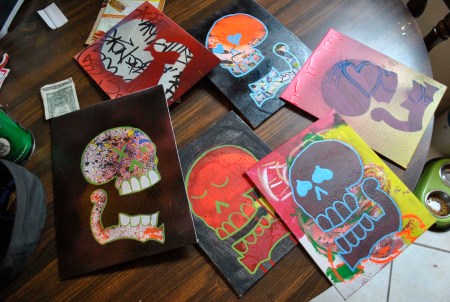 I have about 50 of these canvases, mostly 8×10, but also a couple of 9×12 and 11×14. Each canvas is unique, and the skulls are stenciled with spray paint, and accented with paint markers. If there are specific colors you’d like, let me know and I’d be happy to oblige. 8×10 are $10 dollars, 9×12 are $15, and 11×14 are $20. Shipping costs are already included, so you can’t beat this deal with a stick!