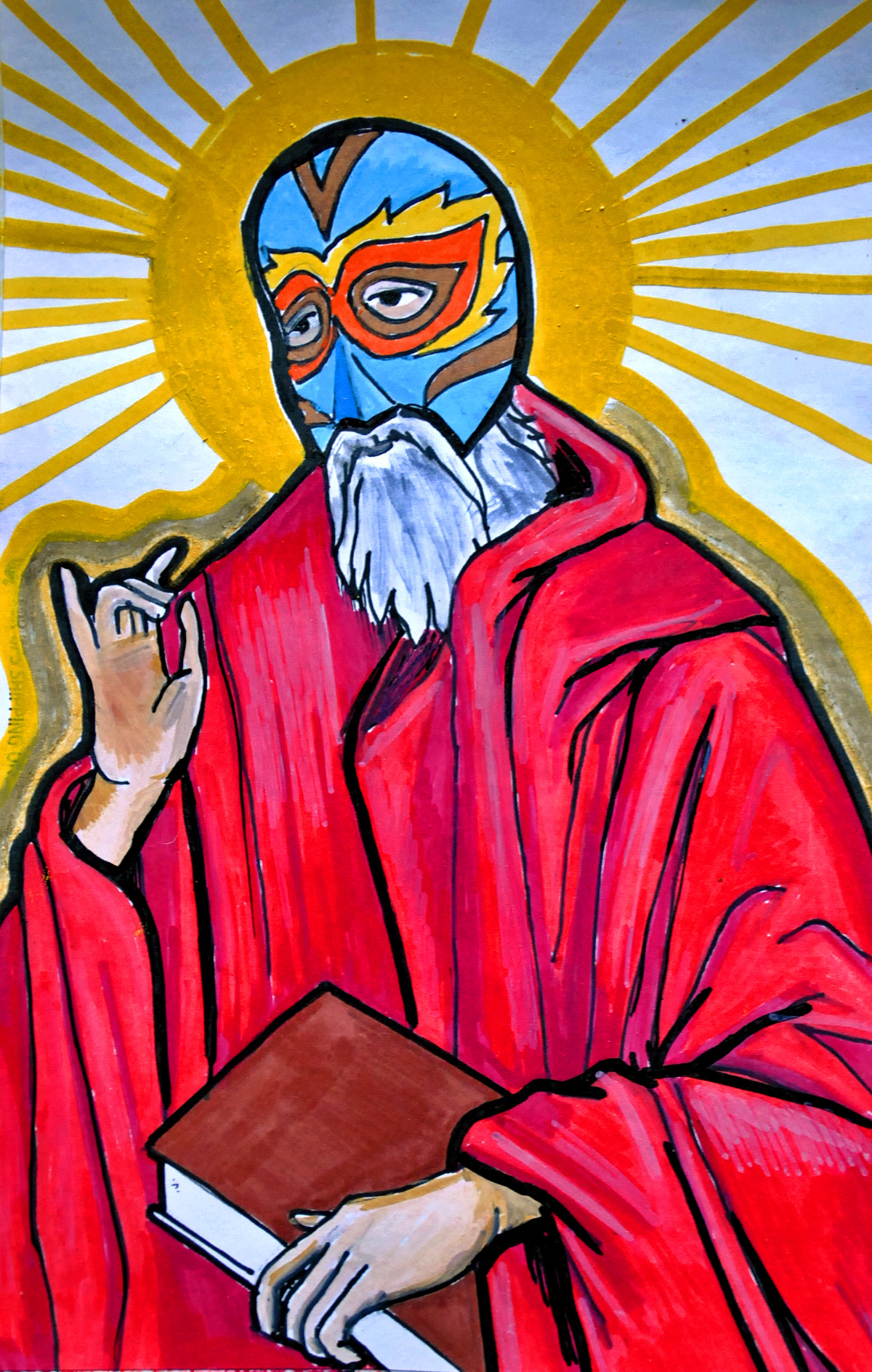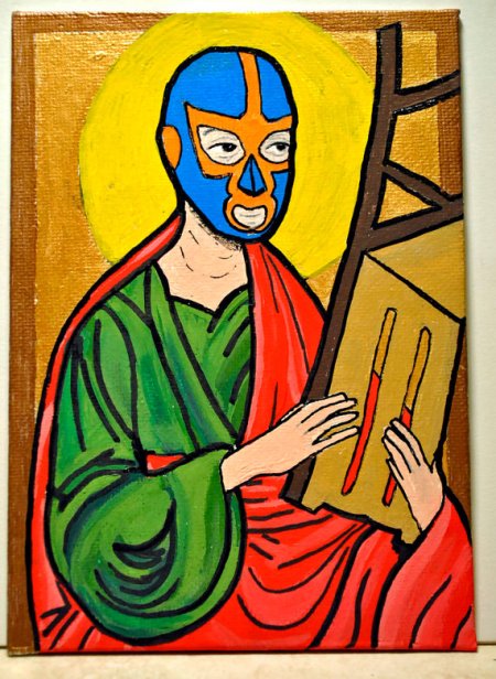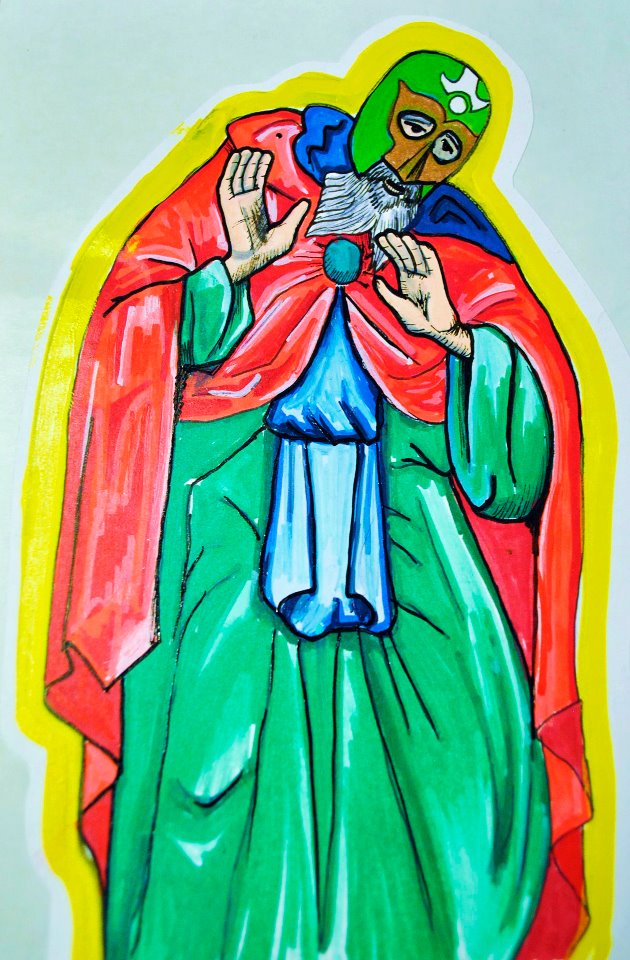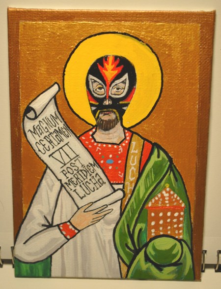Inspired by a painting I had done a couple years ago, I’ve revisited my lucha libre saint icons. It started out as some stickers, and once I acquired some gouache paints, I started doing them on some canvas panels. They are are of various sized, although I’ll be doing more on 5×7 canvas panels (10-15 more in the near future). They’ll be available for sale through Etsy at economy friendly prices. If there’s a certain saint you want to get the lucha libre treatment, feel free to email me for custom icons.